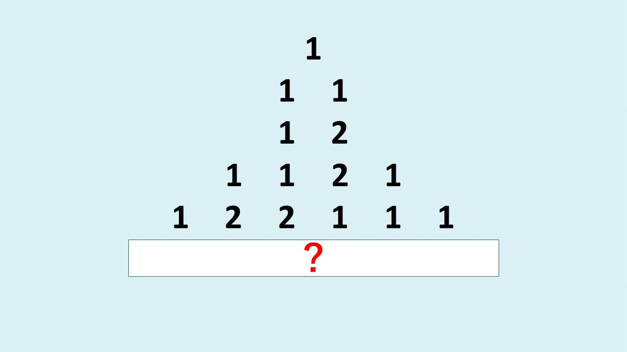 上から 1が1つ ⇒ 1 1 1が2つ ⇒ 1 2 1がつ1つ、2が1つ ⇒ 1 1 2 1 1がつ2つ、2が1つ、1が1つ ⇒ 1 2 2 1 1 1
